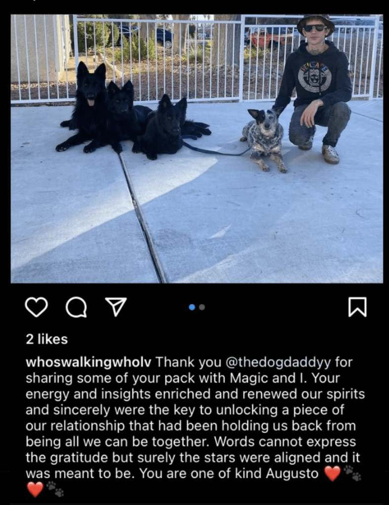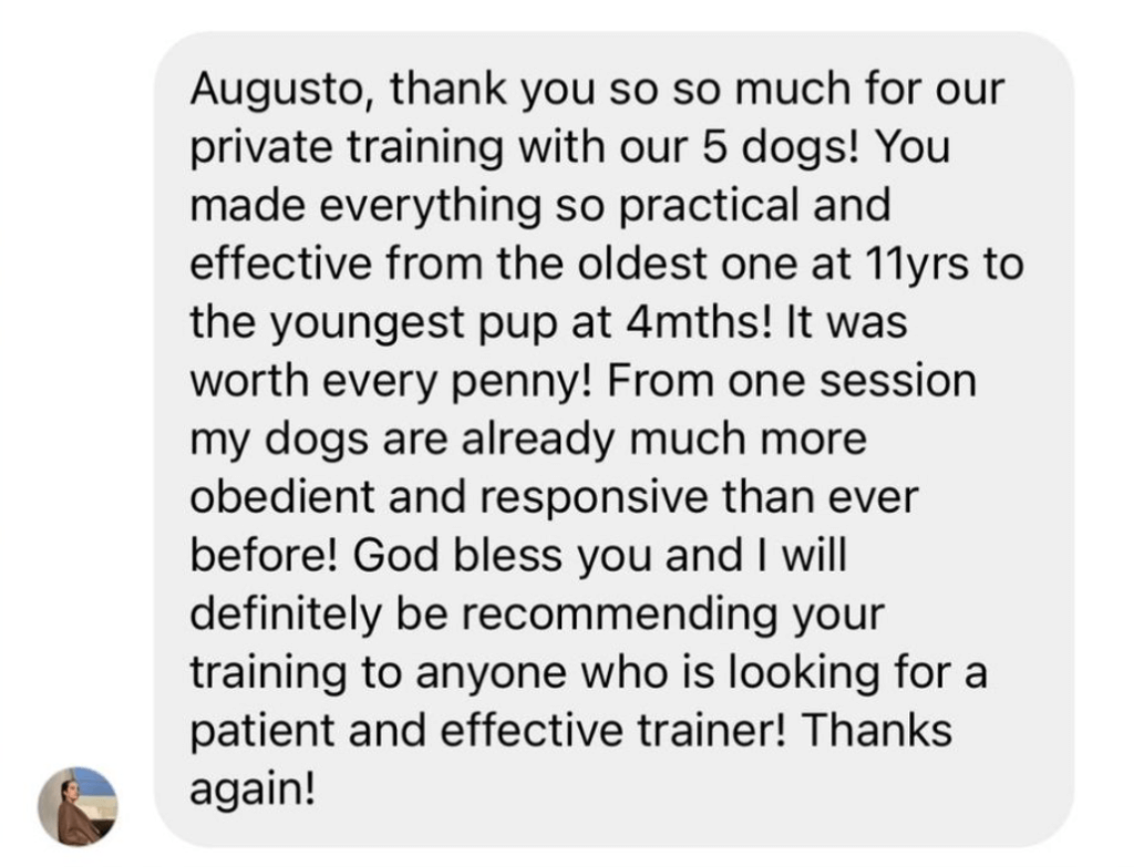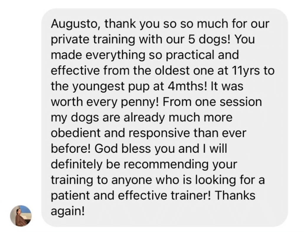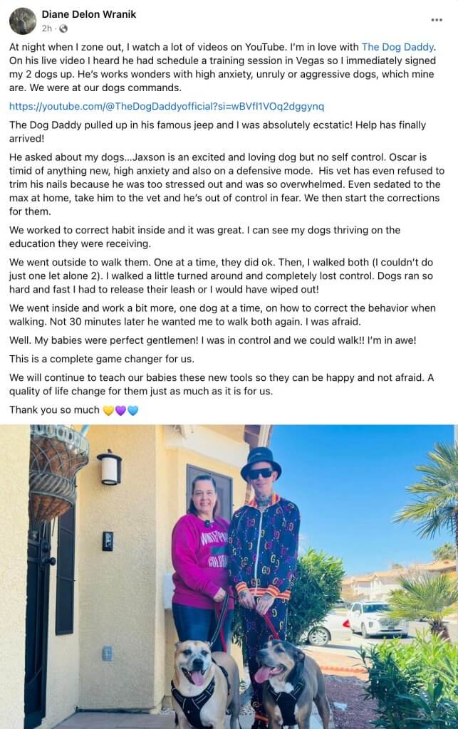 Dog Daddy works exclusively with you, along with any and all dogs in your household, for up to 1.5 hours, depending on your dogs needs.
