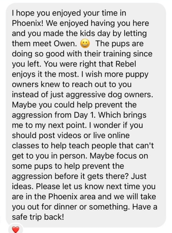Dog Daddy will come to your home or another location within Phoenix or Los Angeles. The price of private lessons is $1,500.
